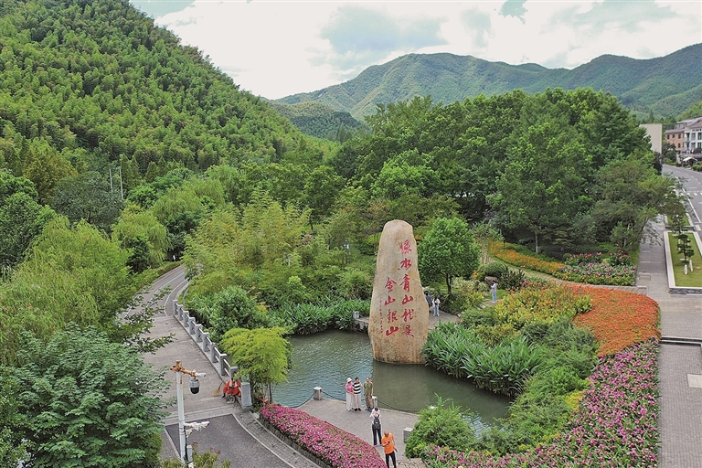 在浙江省湖州市安吉县余村,游客在刻有“绿水青山就是金山银山”的石碑前留影。新华社发