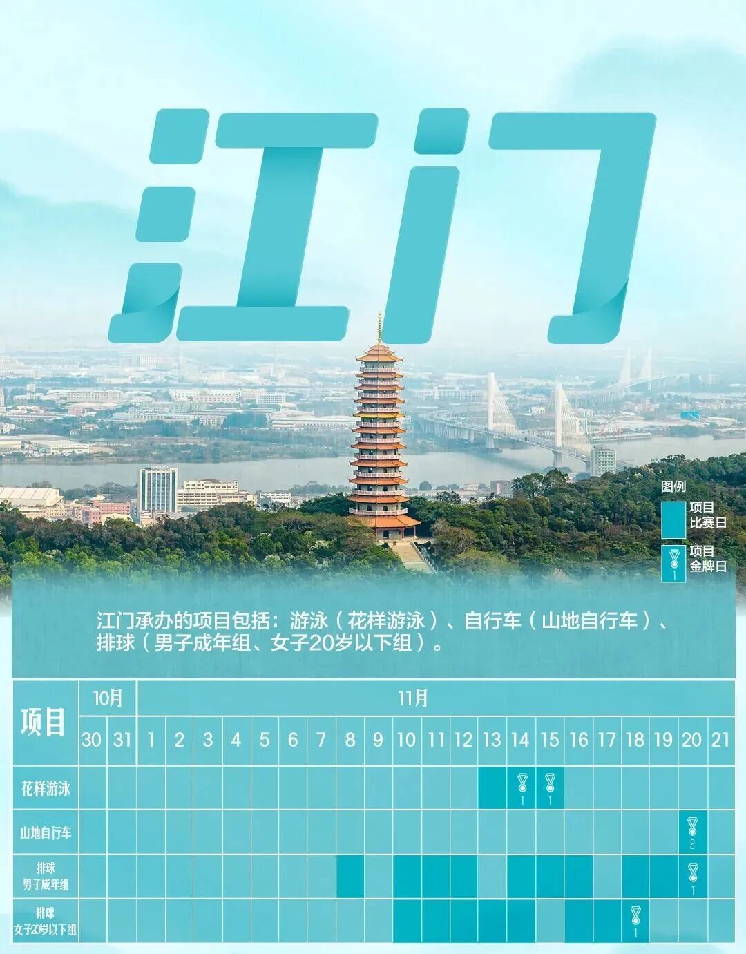 十五运会竞体项目方面,排球(女子20岁以下组)项目定于11月10日-18日在江门体育中心体育馆举办;排球(男子成年组)项目定于11月8日-20日在台山新宁体育馆、台山体育馆举办;花样游泳项目定于11月13日-15日在江门体育中心游泳馆举行;自行车(山地)项目定于11月20日在恩平泉林黄金小镇举办。